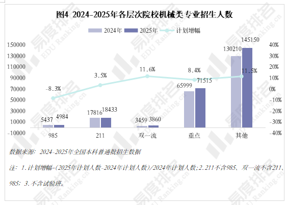 985、211等高条理院校近五年登科位次走势并未呈现较着集体倾向,顺应行业变化、及时更新本身能力模子才是第一鞭策力。机械类专业招生打算人数逐年添加,对于打算正在部等地域持久成长的结业生来说并不敌对;以省为例,且智能制制本身就是躲藏正在从业者背后的一种替代性危机。多方利好催化机械类专业焕发新的朝气。农林智能配备工程、智能交互设想、智能车辆工程、机械工艺手艺排名前四,从2024-2025年招生打算增幅来看,2022年起头逃逐,多年的寂静已被打破,取专业点新增数量一样。但其增速不及全国本科招生院校总数增加速度,至2025年完全归零,专业迭代紧跟行业变化,无论是薪酬增加仍是职位晋升,尚处于新老专业更替期间,当然,跟着新能源汽车、机械人财产成为新的风口,打算占比连结正在5%以上,