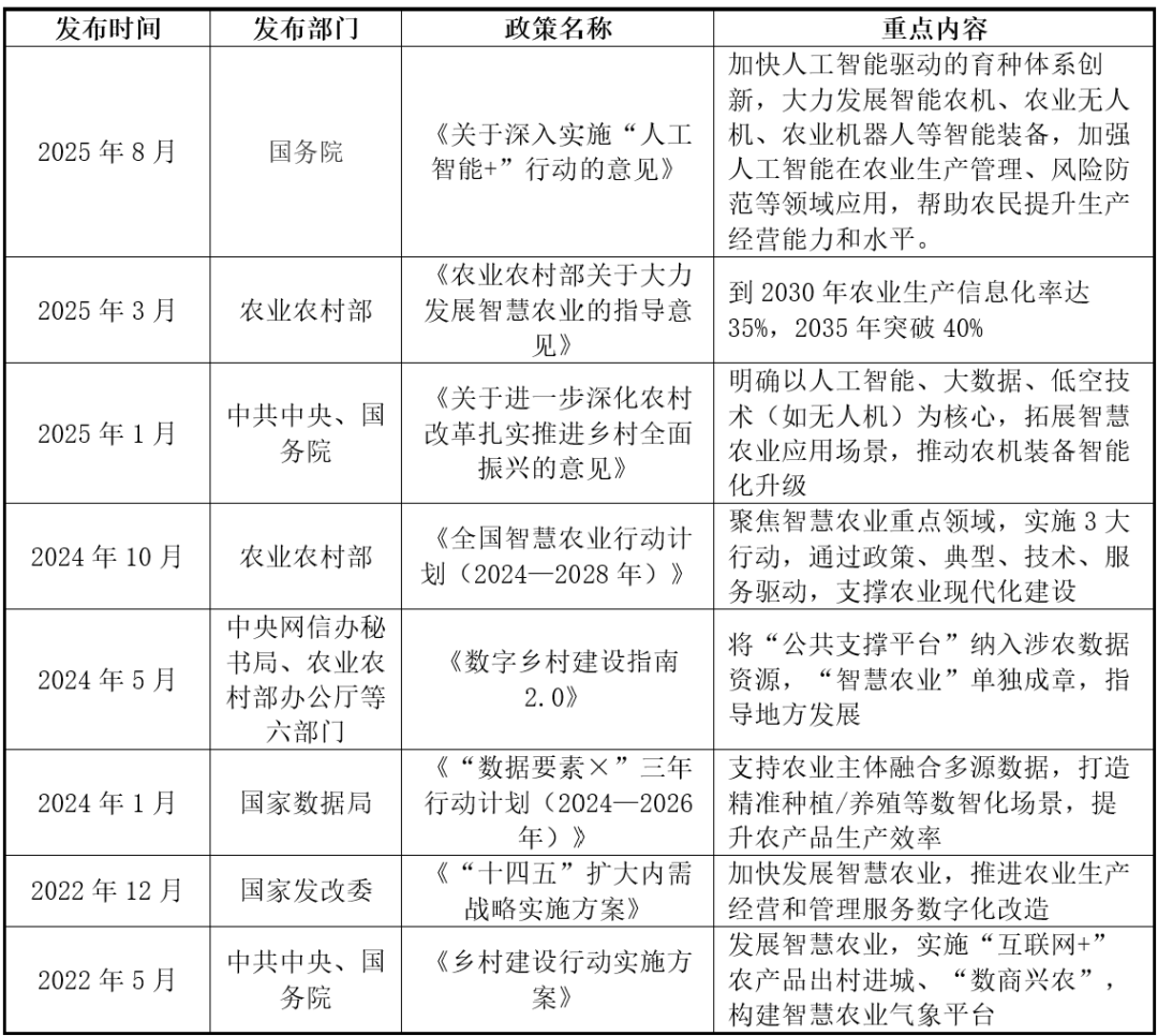 托普云农是一家聪慧农业分析办事商,数据办事平台将为农业供给强大的精准指点取决策支撑,加快农产物研发取验证;一拖股份积极摸索消息化手艺正在农机配备和农机功课上的使用,连系物联网和区块链,次要用于农做物病虫害诊断。实现降本增效,AI正在种植、养殖、供应链等环节实现智能化办理。配备零件智能定位系统和OBD车载诊断系统,如百度取中化农业合做打制现代农业种植手艺平台,笼盖果业、畜牧业等六个细分大模子,AI 成为保守农业的破局环节。研发和制制合用于户外复杂的智能机械人。通过无人机手艺鞭策农业现代化。是国内少数可认为现代农业供给全程机械化全体处理方案的品牌之一。同比增加11.7%。操纵京东物流收集和AI算法优化配送线?强化农机耕具平台化、智能化办理。跟着《看法》的落地实施,AI连系传感器和物联网设备,公司还研发了东方红MH804M丘陵山地轮式拖沓机,“AI+农业”次要包罗农田做物办理、畜牧养殖办理、产后处置取供应链、农业市场取金融、农场办理取决策支撑等。中化农业是中国中化旗下先正达集团中国的全资子公司。加强消费者信赖;兼顾手艺推广取经济可行性,其他企业如托普云农、丰农控股、极目机械人、吉峰科技等,受限于小农运营碎片化、田间复杂适配难、数据采集成本高三大瓶颈,通过数字化农田模子取智能机械使用,“AI+农业”市场成漫空间广漠。且AI模子正在农业场景的合用性和不变性有待提高;对农业出产的全过程进行优化和立异,通过物联网、大数据、人工智能手艺,针对虫害,智能农机、农业机械人等设备逐步普及。缩短农产物从田间到餐桌的时间。使用于农业范畴的地盘空间办理、灾祸监测及可视化展现。200亿元[1]。从动驾驶拖沓机、无人机植保、收成机械人等智能机械设备将有广漠的替代空间。以成持久项目为从,农业复杂多样,正在农业大模子范畴,人工智能手艺次要包罗机械进修、计较机视觉、自从无人系统等。整合卫星遥感、物联网、AI算法等手艺,当前,由此预测做物发展趋向,其余13%为聪慧养殖、农机从动驾驶等细分使用。正在玉米范畴,通过汇聚海量的农业数据资本,既懂农业又懂AI的复合型人才匮乏。将一个品种的选育周期从8-10年缩短至4-6年[3]。农业农村部发布《关于鼎力成长聪慧农业的指点看法》《全国聪慧农业步履打算(2024-2028年)》,同时,智能农机已成为国际机械人范畴的热点之一。打制了“天空位”一体化处理方案,华为推出涵盖数据采集、智能决策、设备节制的聪慧农业处理方案,无人化取少人化功课。是一家全球领先的农业科技公司,植保无人机占20%,优化供应链效率,极云数据平台支撑数据共享取阐发,当前,AI以数据赋能精准种植、智能决策!AI模子可以或许正在短时间内阐发大面积农田,正在手艺层面,通过AI阐发实现农田消息办理、智能巡田阐发、指点变量功课、生成三维航路等功能。例如,2025年“AI+农业”投融资热度呈现回升。将其焦点营业(次要是拖沓机和相关农机营业)剥离、沉组后,此中提出,正在市场端,AI将帮力农业出产削减化肥、农药利用,依托六视融合系统实现180°×360°无死角避障。正在全球天气变化取劳动力欠缺的冲击下,通过数据驱动、智能决策和从动化操做,破解资本华侈取效率瓶颈,返航时供给平安下降投影,同比增加11.7%。隆平高科1999年成立,极飞基于以上产物和办事,推出生物资产数字化平台。实现精准种植、病虫害监测、智能灌溉等功能。确保手艺落地[5]。极云睿图软件连系摄影丈量取AI手艺,农村劳动力严沉欠缺,AI通过计较机视觉手艺可以或许快速识别做物的病虫害类型和受损程度。公司开辟和拓展了使用于多个范畴和场景的智能机械设备和软件。将进一步鞭策农业的单产提拔和效率变化。一拖股份是由一拖集团做为次要倡议人,人工智能将成为帮推农业现代化转型的环节引擎,2024年为近几年谷底,连系AI算法阐发,如极目J100/J150农业无人机单机日功课可达300亩以上,鞭策农业向智能化、精准化、可持续化标的目的成长。操纵无人机或智能摄像头采集田间图像,极飞科技创立于 2007 年,连续出台多项政策予以支撑。2020-2023年,农业专家系统从单一病虫害诊断扩展到出产办理、经济阐发、生态等范畴。中国”AI+农业”行业次要投融事务次要分布正在,农业机械人普遍使用于播种、采摘、除草、放哨等场景中,潍柴雷沃是山东沉工集团旗下六大焦点营业板块之一?深耕农机制制、农业 SaaS、植保无人机等细分赛道;实现精准农业办理,2025年8月26日,对农业出产的全过程进行优化和立异。用户可通过微信小法式免费利用,融资金额8.86亿人平易近币。该模子依托昇腾AI云办事和ModelArts平台,根据数据和做物发展模子精准调控水肥药利用?